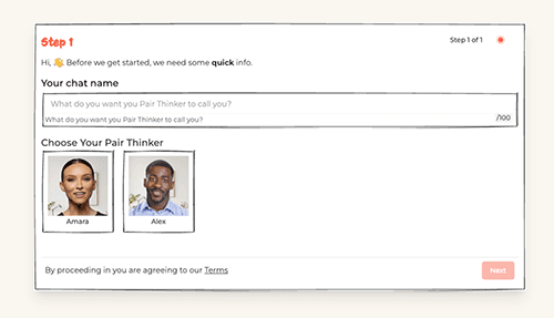 Think out loud, jump ahead, change direction. In the first 10 minutes, your Pair Thinker helps you work through options and choose a way forward.